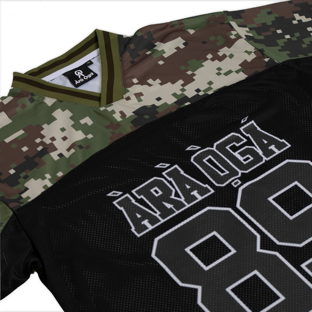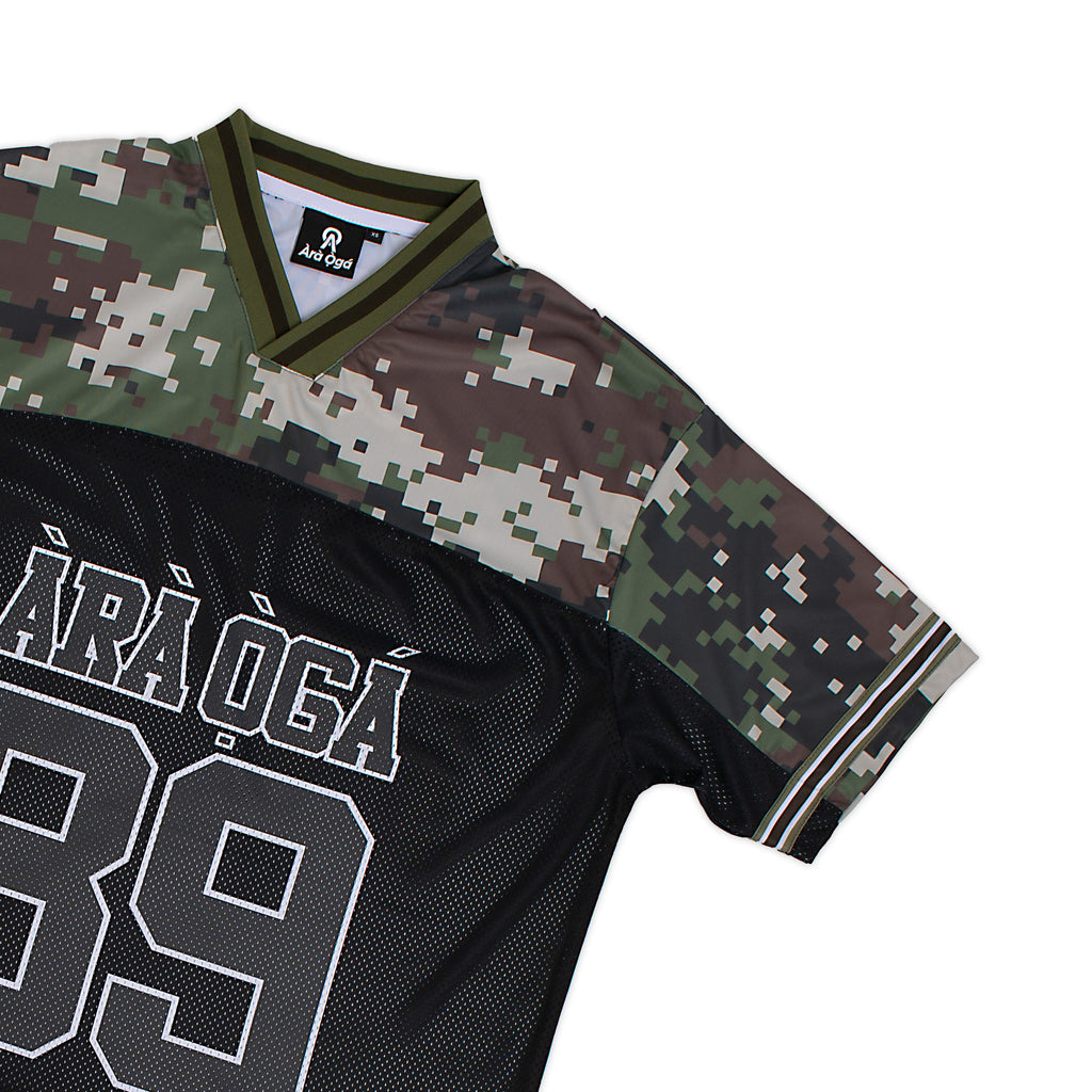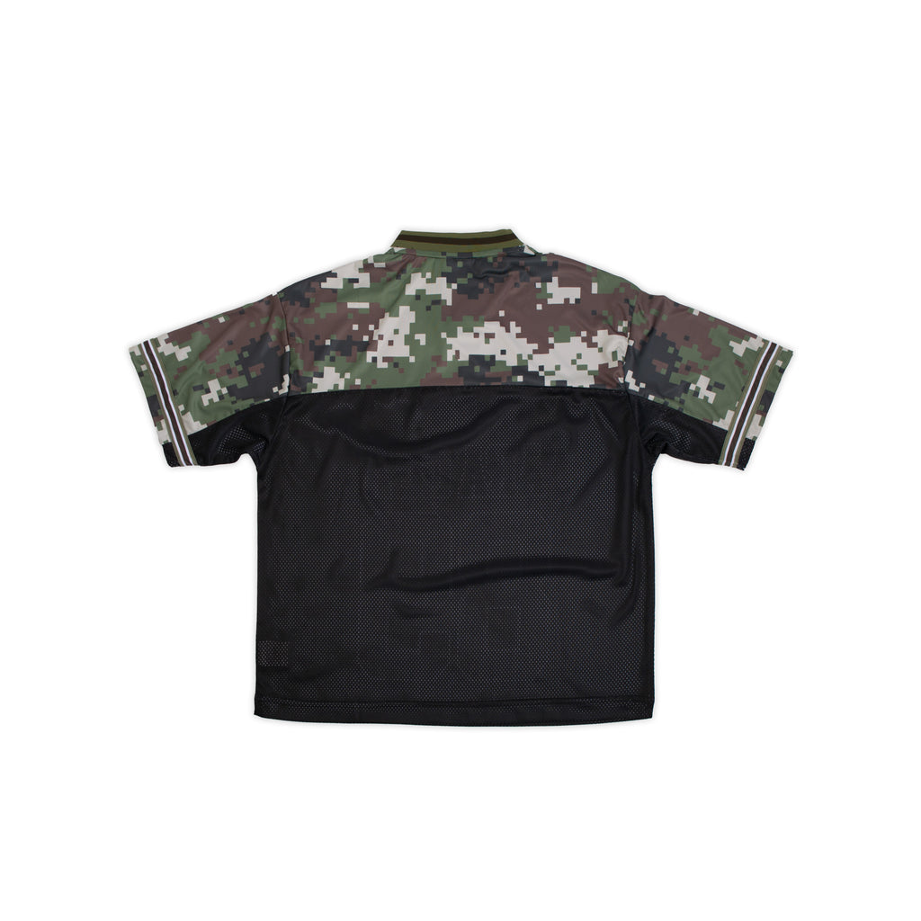 A classic football jersey in soft mesh fabric, featuring a Dual-Tex camo pattern and number graphic. Short sleeves, v-neckline. Boxy Fit. For perfect fit, make sure to go a size down.