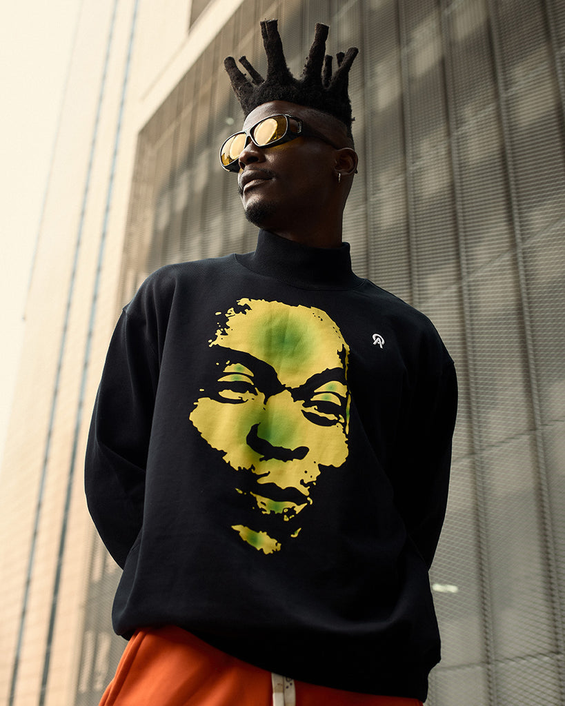 Discover the ARA OGA FELA HIGH-NECK SWEATER—a fashion gem celebrating African pop culture and musical brilliance. Recognizing genius is one thing; transforming it into a fashion bombshell is another level! This piece seamlessly blends plush comfort with killer aesthetics, crafted from groove-friendly 100% French terry cotton for a ticket to pure comfort paradise. The custom high neck adds class and warmth to your style game, while the detailed waist hem and cuffs turn up the swagger. Featuring the vector image of Fela Anikulapo-Kuti, it's a mic-drop moment and a visual tribute to African musical genius. The ARA OGA FELA HIGH-NECK SWEATER is more than apparel; it's a groove of culture and identity, curated by a fashion genius for those who believe style is music.